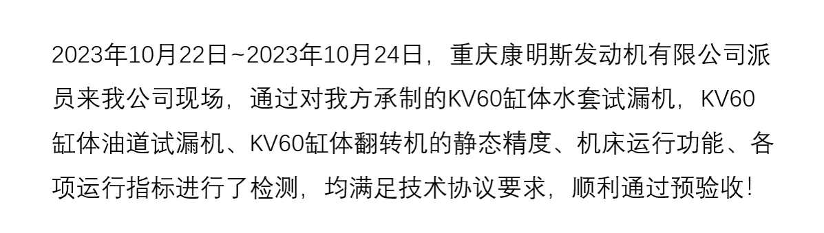 熱烈祝賀重慶康明斯發(fā)動機(jī)有限公司KV60缸體水套試漏機(jī)、KV60缸體油道試漏機(jī)、KV60缸體翻轉(zhuǎn)機(jī)順利通過預(yù)驗(yàn)收!