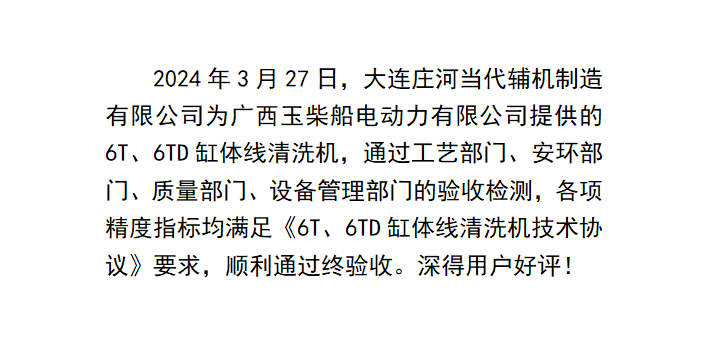熱烈祝賀廣西玉柴船電動力有限公司6T、6TD缸體線清洗機(jī)順利通過終驗(yàn)收!