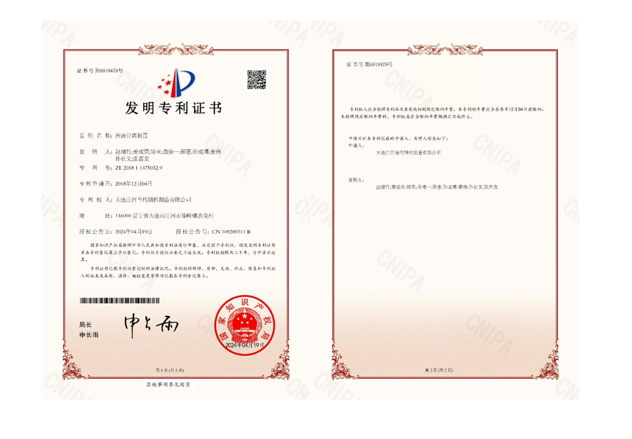熱烈祝賀大連莊河當代輔機制造有限公司 發(fā)明專利【渣液分離裝置】榮獲國家知識產(chǎn)權(quán)局授權(quán)